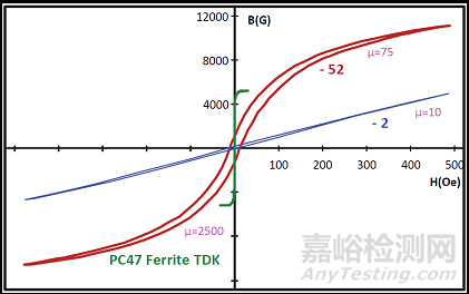 圖3所示為TDK所制之PC47錳鋅鐵氧體與MICROMETALS所制之鐵粉芯-52及-2的B-H曲線;錳鋅鐵氧體的相對(duì)磁導(dǎo)率遠(yuǎn)高于鐵粉芯,飽和磁通密度也相差很多,鐵氧體約5000高斯而鐵粉芯大于10000高斯以上。