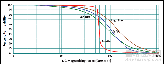 圖4、粉末鐵芯與有氣隙的鐵氧體鐵芯在不同磁場(chǎng)強(qiáng)度下的磁導(dǎo)下降特性