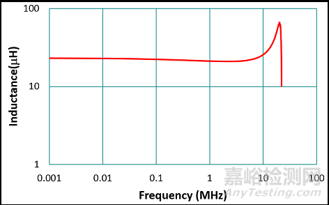 電感器之電感值在電路設(shè)計(jì)時(shí)為最重要的基本參數(shù),但必須看在工作頻率下此電感值是否穩(wěn)定。電感的標(biāo)稱值通常是在沒有外加直流偏置的條件下,以100 kHz或1 MHz所量得。且為確保大量自動(dòng)化生產(chǎn)的可能性,電感之容差值(tolerance)通常是 ±20%(M)與±30%(N)居多。圖5為利用Wayne Kerr的LCR表量測(cè)Taiyo Yuden 電感NR4018T220M之電感-頻率特性圖,如圖所示,在5 MHz之前電感值的曲線較為平坦,電感值幾乎可視為常數(shù)。在高頻段因寄生電容與電感所產(chǎn)生的諧振,電感值會(huì)上升,此諧振頻率稱為自我諧振頻率(self-resonant frequency;SRF),通常需遠(yuǎn)高于工作頻率。