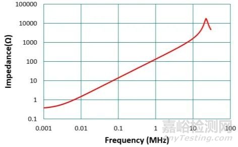 如圖6,從阻抗圖也可以看出電感在不同頻率下的表現(xiàn)。電感的阻抗約與頻率成正比(Z=2πfL),因此頻率愈高,電抗會(huì)比交流電阻大很多,所以阻抗表現(xiàn)就如同純電感(相位為90?)。而再往高頻,由于寄生電容效應(yīng),可以看到阻抗的自我諧振頻率點(diǎn),過了此點(diǎn)阻抗下降呈現(xiàn)電容性,且相位逐漸轉(zhuǎn)為-90 ?。