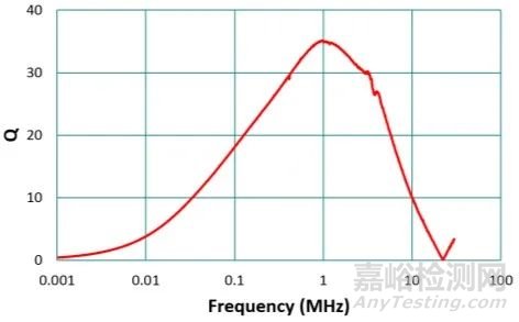 在低頻段,交流電阻比電感造成的電抗大,所以其Q值很低;隨著頻率增加,電抗(約為2πfL)愈來愈大,即使電阻因集膚效應(yīng)(skin effect)與鄰近(proximity effect)效應(yīng)愈來愈大,Q值仍隨頻率增加;在接近SRF時(shí),電感抗逐漸為電容抗抵消,Q值又逐漸變小;在SRF時(shí)變?yōu)榱?,因電感抗與電容抗完全相消。圖7為NR4018T220M之Q值與頻率的關(guān)系圖,其關(guān)系呈現(xiàn)倒鐘形。