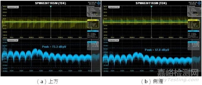 鐵氧體電感的封裝結(jié)構(gòu)有非遮蔽式、加磁膠之半遮蔽式、與遮蔽式,而不論哪一種都存在相當(dāng)?shù)目諝庀?。顯然此空氣隙會(huì)有漏磁發(fā)生,且最壞的情況是會(huì)干擾周遭之小信號(hào)電路,或者,如果附近有導(dǎo)磁材料,其電感值也因此被改變。另一種封裝結(jié)構(gòu)為沖壓式鐵粉電感,由于電感內(nèi)部沒有間隙,且繞組結(jié)構(gòu)扎實(shí),因此磁場(chǎng)散逸問題較小。圖10是利用RTO 1004示波器之FFT功能量測(cè)沖壓式電感上方及側(cè)邊3mm處之漏磁場(chǎng)大小。表4列出不同封裝結(jié)構(gòu)電感的漏磁場(chǎng)大小比較,可看出非遮蔽式(non-shielded)電感之漏磁最嚴(yán)重;沖壓式(molded)電感的漏磁最小,顯示其磁遮蔽效果最好。這兩種結(jié)構(gòu)的電感之漏磁場(chǎng)大小相差約14dB,也就是將近5倍。