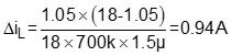 設(shè)計(jì)實(shí)例:以RT7276先進(jìn)恒定導(dǎo)通時(shí)間(Advanced Constant On-Time;ACOT®)之同步整流降壓轉(zhuǎn)換器來設(shè)計(jì),其開關(guān)頻率為700 kHz,輸入電壓為4.5V到18V,輸出電壓為1.05V,滿載電流為3A。如上所述,電感值須設(shè)計(jì)在最大輸入電壓18V及滿載3A的條件下,將γ值取0.35,將上述數(shù)值代入式(7),得電感值為: