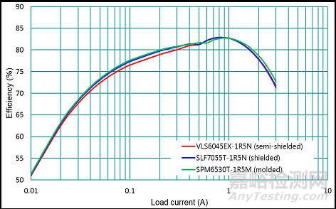 表5所列為可選用之TDK不同系列的電感,尺寸相近但封裝結(jié)構(gòu)不同。從表中可知,沖壓式電感(SPM6530T-1R5M)的飽和電流及額定電流大,且熱阻小、散熱佳。另外,根據(jù)前章之探討,沖壓式電感的鐵芯材質(zhì)屬于鐵粉芯,因此相較于加磁膠之半遮蔽式(VLS6045EX-1R5N)及遮蔽式(SLF7055T-1R5N)電感的鐵氧體鐵芯,具有較好的直流偏置特性。圖11為不同電感應(yīng)用于RT7276先進(jìn)恒定導(dǎo)通時(shí)間之同步整流降壓轉(zhuǎn)換器的效率比較,結(jié)果顯示三者之效率差異并不大。而若考慮散熱、直流偏置特性及磁場(chǎng)散逸問題,建議選用SPM6530T-1R5M電感。