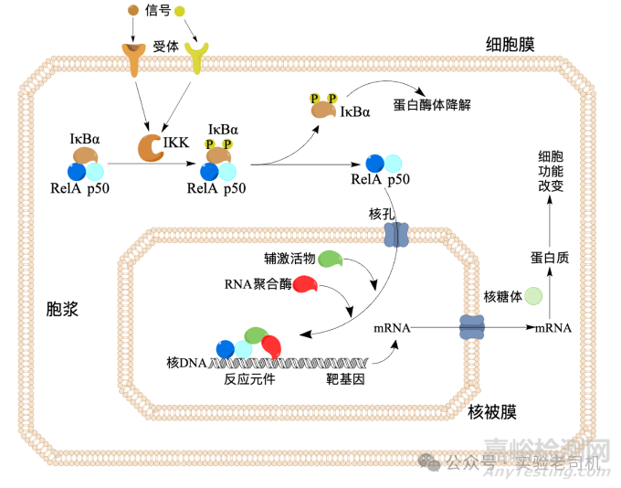 通常地,在未受到刺激的細(xì)胞中,NF-κB通常與抑制蛋白IκB結(jié)合形成復(fù)合物,存在于細(xì)胞質(zhì)中。然而,當(dāng)細(xì)胞受到細(xì)胞因子(如IL-1β、TNF等)、脂多糖(LPS)等外界刺激時(shí),在經(jīng)典的NF-κB信號通路中這些刺激信號首先與細(xì)胞膜上的相應(yīng)受體結(jié)合最后導(dǎo)致IκB被降解,進(jìn)而釋放出NF-κB二聚體,自由的NF-κB二聚體由于其C端結(jié)構(gòu)域上的核定位區(qū)域暴露,能夠通過核孔復(fù)合物進(jìn)入細(xì)胞核。在細(xì)胞核內(nèi),NF-κB二聚體與有NF-κB結(jié)合位點(diǎn)的基因啟動子區(qū)域或增強(qiáng)子區(qū)域特異性結(jié)合,啟動相關(guān)基因的轉(zhuǎn)錄。
