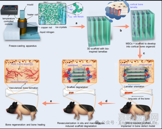 在醫(yī)學(xué)領(lǐng)域,骨缺損修復(fù)是一個(gè)長(zhǎng)期困擾患者和醫(yī)生的難題,尤其是那些因腫瘤切除、感染、外傷等造成的超過一定大小無法自然愈合的缺損,往往需要復(fù)雜的治療方法。傳統(tǒng)的治療方法往往效果有限,且存在諸多局限性。然而,隨著科技的進(jìn)步,一種新的方法正在為這一難題提供解決方案——利用純天然絲素蛋白(SF)通過冷凍鑄造技術(shù)制成具有皮質(zhì)骨樣層狀結(jié)構(gòu)的3D支架。展現(xiàn)出了強(qiáng)大的修復(fù)大型骨缺損的能力,甚至無需添加生長(zhǎng)因子,就能在豬模型上實(shí)現(xiàn)骨再生,這項(xiàng)技術(shù)或?qū)⒊蔀楣侨睋p患者的福音!近期,相關(guān)工作以題為“Oriented Cortical-Bone-Like Silk Protein Lamellae Effectively Repair Large Segmental Bone Defects in Pigs”的文章發(fā)表在材料領(lǐng)域知名期刊《Advanced Materials》。