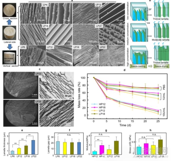 研究人員首先對(duì)比了由傳統(tǒng)冷凍干燥法制備的蜂窩狀多孔(HP)支架與采用冷凍鑄造法制備的單向?qū)訝疃嗫祝↙P)結(jié)構(gòu)SF支架。掃描電鏡觀察顯示,所有SF冷凍鑄造支架表面和內(nèi)部均呈現(xiàn)出均勻的層狀結(jié)構(gòu),與天然皮質(zhì)骨的微觀結(jié)構(gòu)高度相似,層厚隨SF濃度增加而增加,從6%到22%,層厚從0.9微米增加到3.8微米。這表明,通過調(diào)整SF濃度,可以有效控制支架的微觀結(jié)構(gòu)及其機(jī)械性能。實(shí)驗(yàn)結(jié)果顯示,所有LP支架在相同SF濃度下的彈性模量和壓縮應(yīng)力在片層結(jié)構(gòu)冰晶生長(zhǎng)的長(zhǎng)軸方向上均高于HP支架。這意味著,通過冷凍鑄造技術(shù)制造出的具有均勻?qū)訝罱Y(jié)構(gòu)的SF支架不僅具備較高的機(jī)械強(qiáng)度,而且其力學(xué)性能接近宿主骨,適合用于承重部位的骨組織工程,有助于恢復(fù)骨組織的正常功能。研究還評(píng)估了不同SF支架在生理環(huán)境下的降解率。有趣的是,LP支架的降解速度比HP支架更快,這為骨缺損修復(fù)提供了更合適的時(shí)間窗口。適中的降解速率有助于為新生骨組織提供合適的空間(圖2)。