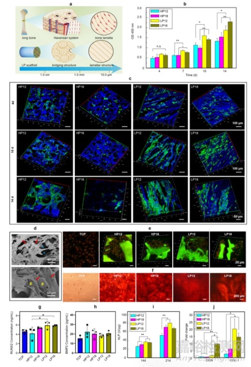 圖3 MSCs在SF基3D支架中的形態(tài)、增殖和成骨分化;a) 天然骨和LP支架的微觀到宏觀形態(tài)示意圖,顯示皮質(zhì)骨組織和LP支架在微米級(jí)別具有相似的層狀結(jié)構(gòu),有利于細(xì)胞粘附和遷移;b) SF基3D支架內(nèi)hMSCs的長(zhǎng)期細(xì)胞活性;c) hMSCs在SF支架內(nèi)培養(yǎng)4、10和14天后的3D共聚焦成像。綠色熒光代表FITC標(biāo)記的細(xì)胞,藍(lán)色熒光表示SF支架的自發(fā)熒光;d) SEM圖像顯示,LP支架層狀結(jié)構(gòu)上的hMSCs明顯沿層狀延伸方向伸長(zhǎng),而HP支架上的hMSCs隨機(jī)伸長(zhǎng);e, f) 在成骨誘導(dǎo)培養(yǎng)基中培養(yǎng)14天的rMSCs的免疫熒光染色(e,細(xì)胞中的BMP2標(biāo)記為綠色,細(xì)胞中的Runx2標(biāo)記為紅色;支架在大面積上也表現(xiàn)出自發(fā)的綠色熒光)和茜素紅染色(f);g, h) 通過ELISA在14天時(shí)培養(yǎng)基上清液中RUNX2(g)和BMP2(h)濃度的定量分析;i, j) 在正常培養(yǎng)基中培養(yǎng)14天的hMSCs的ALP定量分析(i)和歸一化的OCN和Col-1 mRNA水平(j)