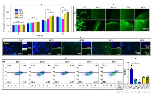 圖4 LP支架對(duì)hUVEC細(xì)胞行為和巨噬細(xì)胞極化的影響;a) hUVECs在LP支架上的增殖評(píng)估;b) hUVECs在支架上的形態(tài)。c) 在支架上培養(yǎng)的hUVECs中CD31表達(dá)的免疫熒光可視化;d, e) 在SF基支架(LP和HP)上培養(yǎng)的巨噬細(xì)胞的流式細(xì)胞術(shù)(d)和M1/M2極化圖(e)
