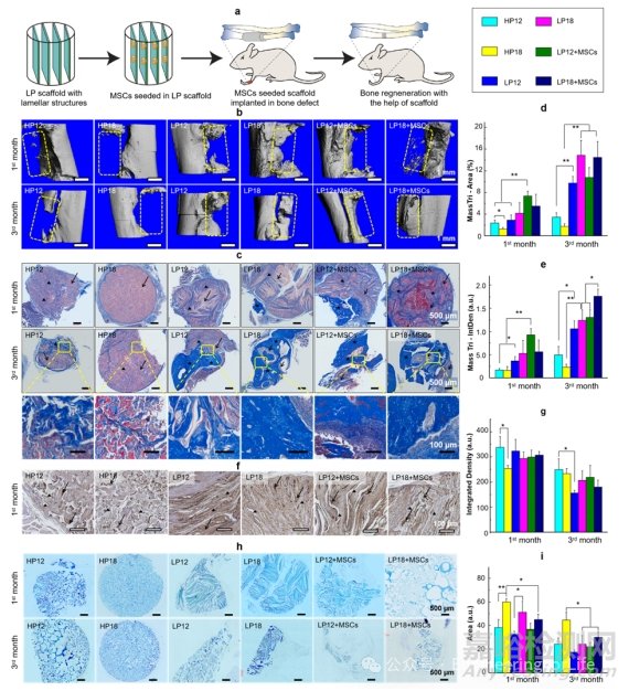 圖5 使用圓柱形LP支架修復(fù)大鼠橈骨缺損;a) 示意圖顯示在大鼠骨缺損模型中接種hMSCs的LP支架以誘導(dǎo)成骨;b) 支架植入缺損區(qū)域后1個(gè)月和3個(gè)月的 micro-CT 圖像。虛線框顯示原始缺損區(qū)域;c) 植入1個(gè)月和3個(gè)月后支架與再生組織復(fù)合物的典型MT染色;d, e) MT染色的面積百分比(d)和強(qiáng)度密度(e)的半定量結(jié)果;f, g) 手術(shù)后1個(gè)月接種或未接種hMSCs的支架中OPN的免疫組織學(xué)特征;h, i) 甲苯胺藍(lán)染色圖像(h)和半定量結(jié)果(i)