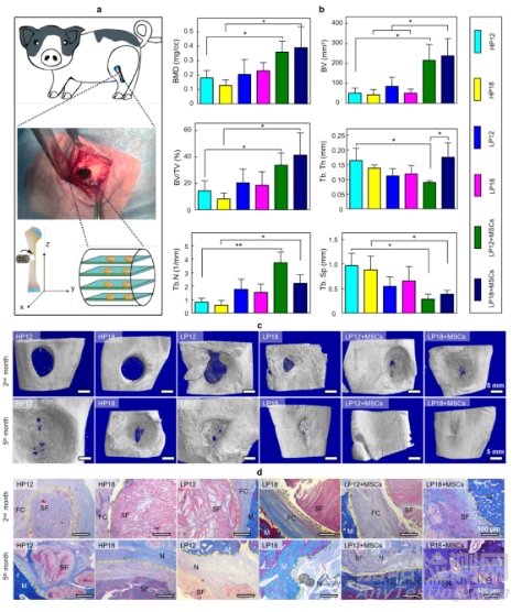 圖6 在豬脛骨缺損中使用垂直于長(zhǎng)骨長(zhǎng)軸(z軸)的層狀LP支架進(jìn)行骨再生分析;a) 示意圖顯示豬LSBD模型的建立以及SF支架在缺損部位的定向和放置;b) 術(shù)后兩個(gè)月的定量 micro-CT 評(píng)估骨參數(shù),包括骨礦物質(zhì)密度(BMD)、組織體積比(BV, BV/TV)和小梁骨屬性(Tb. Th, Tb. N, Tb. Sp);c) 植入2個(gè)月和5個(gè)月后豬脛骨骨再生的代表性micro-CT 圖像;d) 支架-組織復(fù)合物的典型MT染色
