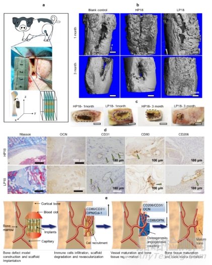 圖7 在豬脛骨缺損中使用平行于長(zhǎng)骨z軸的層狀LP支架進(jìn)行血管化和骨再生。a) 示意圖顯示矩形豬骨缺損模型的構(gòu)建和矩形SF支架的植入;b) 再生豬骨的代表性 micro-CT 圖像;c) 圖像顯示植入后1個(gè)月和3個(gè)月的再生骨組織。虛線框表示支架存在的位置;d) 豬骨缺損模型中OCN、CD31、CD80和CD206的MT染色和免疫組織學(xué)特征;e) 示意圖顯示LP支架在缺損骨部位誘導(dǎo)基于血管化的骨再生過程。當(dāng)LP支架植入時(shí),血凝塊在LP支架周圍形成,并在手術(shù)期間吸引炎癥細(xì)胞識(shí)別支架。在植入中期,LP支架在體內(nèi)巨噬細(xì)胞的影響下有序降解;同時(shí),小血管和骨痂在植入支架部位逐漸形成。在后期,LP支架在體內(nèi)降解,骨痂組織轉(zhuǎn)變?yōu)榻Y(jié)構(gòu)有序的成熟骨組織