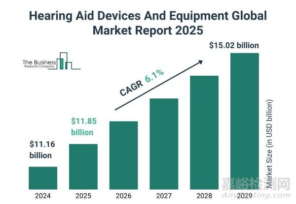 2024年全球聽力設(shè)備市場(chǎng)規(guī)模為111.6億美元,預(yù)計(jì)2025年將達(dá)到118.5億美元,年復(fù)合增長(zhǎng)率為6.2%。到2029年,市場(chǎng)規(guī)模有望增長(zhǎng)至150.2億美元。