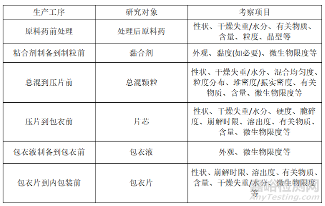 口服包衣片劑存放時(shí)限的生產(chǎn)工序、研究對(duì)象、考察項(xiàng)目