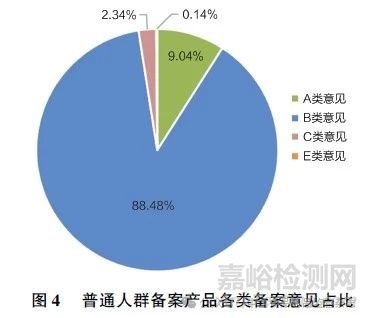在普通人群備案產(chǎn)品中,被出具“ 備案通過”意見(以下簡(jiǎn)稱A 類意見) 的備案產(chǎn)品197 件,占比9. 04%; 被出具“責(zé)令改正” 意見( 以下簡(jiǎn)稱B類意見) 的備案產(chǎn)品1928 件,占比88. 48%; 被出具“責(zé)令改正并暫停生產(chǎn)或進(jìn)口銷售” 意見( 以下簡(jiǎn)稱C 類意見) 的備案產(chǎn)品51 件,占比2. 34%;被出具“取消備案” 意見(以下簡(jiǎn)稱E 類意見) 的備案產(chǎn)品3 件,占比0. 14% (圖4)。
