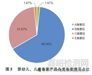 在嬰幼兒、兒童備案產(chǎn)品中,被出具A 類意見的備案產(chǎn)品1 件,占比1. 67%;被出具B 類意見的備案產(chǎn)品39 件, 占比65. 00%; 被出具C 類意見的備案產(chǎn)品19 件,占比31. 67%;被出具E 類意見的備案產(chǎn)品1 件,占比1. 67% (圖5)。
