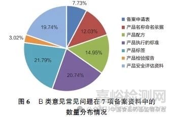B 類意見常見問題涉及7 項(xiàng)備案資料。其中,涉及備案申請(qǐng)表的435 條,占比7. 73%; 涉及產(chǎn)品名稱命名依據(jù)的677 條,占比12. 03%;涉及產(chǎn)品配方的841 條,占比14. 95%;涉及產(chǎn)品執(zhí)行的標(biāo)準(zhǔn)的1167 條, 占比20. 74%;涉及產(chǎn)品標(biāo)簽的1226 條,占比21. 79%;涉及產(chǎn)品檢驗(yàn)報(bào)告的170 條,占比3. 02%;涉及產(chǎn)品安全評(píng)估資料的1111 條,占比19. 74% (圖6)。