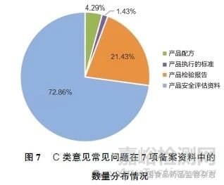 C 類意見常見問題涉及4 項(xiàng)備案資料。其中,涉及產(chǎn)品配方的3 條,占比4. 29%; 涉及產(chǎn)品執(zhí)行的標(biāo)準(zhǔn)的1 條, 占比1. 43%;涉及產(chǎn)品檢驗(yàn)報(bào)告的15 條,占比21. 43%;涉及產(chǎn)品安全評(píng)估資料的51條,占比72. 86% (圖7)。