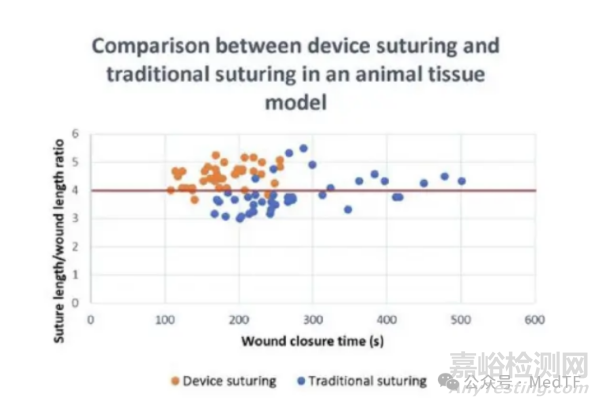 在前兩項(xiàng)研究中,Suture-TOOL在動(dòng)物組織模型和人體模型中與金標(biāo)準(zhǔn)手動(dòng)縫合進(jìn)行了比較。結(jié)果顯示,SL/WL(suture length-to-wound length)≥4的裝置為95-98%,而手動(dòng)縫合為30-69%。Suture-TOOL縫合速度比手動(dòng)縫合快30%。