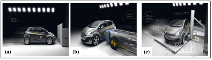 圖1 車輛測試協(xié)議:(a)正面碰撞測試,(b)側(cè)面碰撞測試,以及(c)斜桿測試
