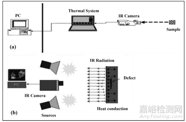紅外熱成像技術(shù) (IFT) 是一種利用紅外輻射檢測材料缺陷或損傷的非接觸方法。復(fù)合材料由于其低熱導(dǎo)率,非常適合用于 IFT 檢測損傷。IFT 可以采用兩種方式:被動和主動。被動方法涉及對復(fù)合材料進(jìn)行熱掃描,而不應(yīng)用外部熱量,這適用于與周圍空氣溫度不同的材料。主動熱成像技術(shù)如圖 6(a) 所示,主動熱成像技術(shù)需要對材料進(jìn)行控制加熱,以在材料內(nèi)部誘導(dǎo)熱對比度,并通過材料表面上的溫度變化來揭示缺陷。