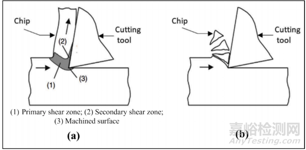 圖 7 (a) 塑性變形產(chǎn)生的切屑(例如金屬)和 (b) 剪切變形產(chǎn)生的切屑(例如復(fù)合材料)