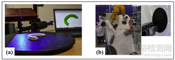 圖 8 (a) 使用 ATOS Core 80 對復(fù)雜組件進(jìn)行 3D 掃描 (b) 3D 組件的機(jī)器人自動化修復(fù)