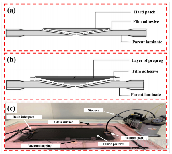 圖 10 (a) 硬補(bǔ)片修復(fù)方法的橫截面圖, (b) 預(yù)浸料軟補(bǔ)片修復(fù)方法, (c) 原位樹脂注射修復(fù)方法。