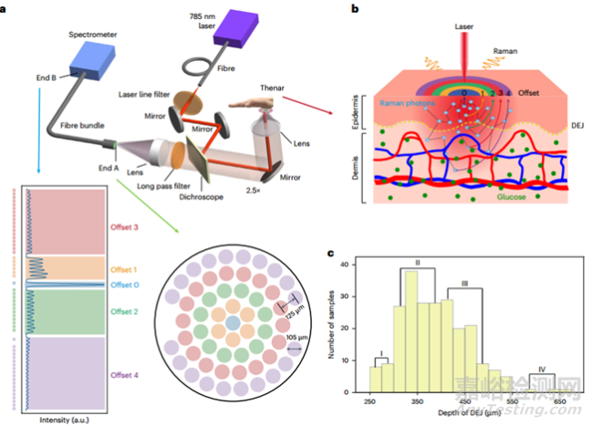 a,mµSORS系統(tǒng)原理圖;b,mµors檢測示意圖;c,由OCT識別的232個人類thenar樣本的DEJ深度直方圖