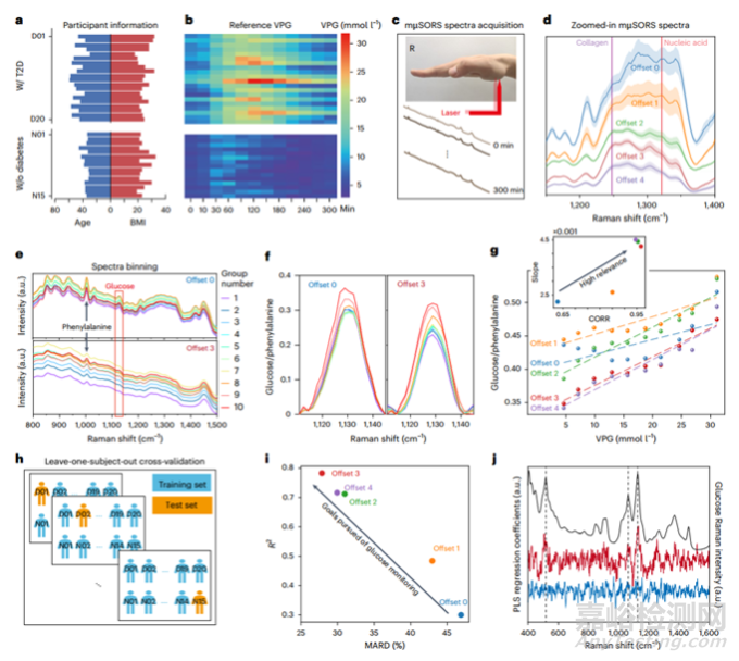 為了進(jìn)一步驗(yàn)證該無創(chuàng)血糖檢測技術(shù)的準(zhǔn)確性和通用性,研究團(tuán)隊(duì)在第二階段針對 200 例糖尿病和 30 位正常健康人群開展了臨床研究,共收集了 30 多萬套由金標(biāo)準(zhǔn)靜脈血血糖值所標(biāo)定的 mμSORS 光譜數(shù)據(jù)集,并進(jìn)行血糖預(yù)測模型建模及分析。