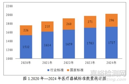1.標準數(shù)量穩(wěn)步提升。截至2024年底,現(xiàn)行有效醫(yī)療器械標準共計2023項,其中國家標準296項,行業(yè)標準1727項(見下表)。“十四五”以來,醫(yī)療器械國家標準和行業(yè)標準數(shù)量呈現(xiàn)逐年穩(wěn)定上升趨勢(見圖1)。