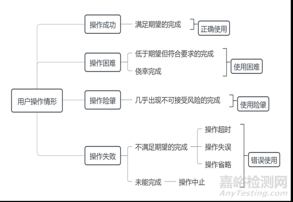 醫(yī)療器械實(shí)際使用情況較為復(fù)雜,可細(xì)分為正確使用、使用困難、使用險(xiǎn)肇、錯(cuò)誤使用,分別指滿足期望的使用、低于期望但符合要求的使用、幾乎出現(xiàn)不可接受風(fēng)險(xiǎn)的使用,不滿足期望或未完成的使用。其中,使用困難可根據(jù)具體情況加以改進(jìn),使用險(xiǎn)肇需要采取預(yù)防措施,錯(cuò)誤使用需要采取糾正措施。