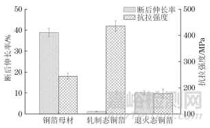 圖5 銅箔母材和不同加工狀態(tài)壓延銅箔沿軋制方向的拉伸性能
