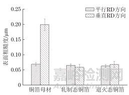 圖6 銅箔母材和不同加工狀態(tài)壓延銅箔RD面和TD面的表面粗糙度