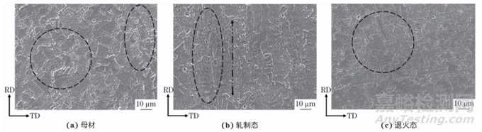 圖 1 銅箔母材和不同加工狀態(tài)壓延銅箔ND面的 SEM 形貌