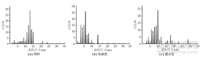 圖 2 銅箔母材和不同加工狀態(tài)壓延銅箔的晶粒尺寸分布