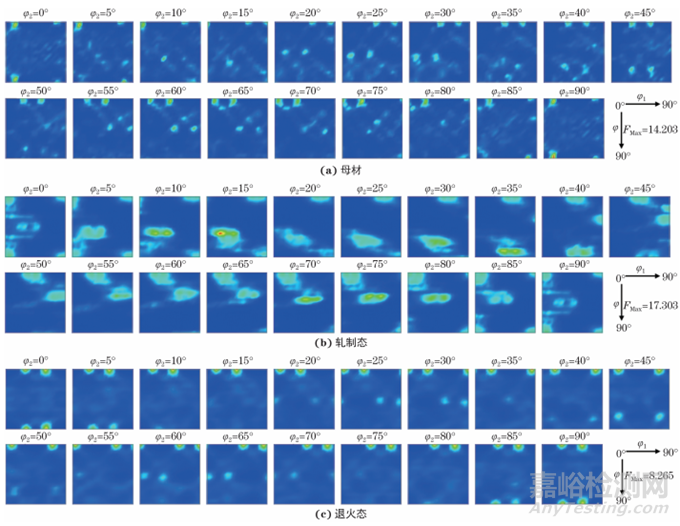 圖 3 銅箔母材和不同加工狀態(tài)壓延銅箔的取向分布函數(shù)圖