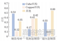 圖 4 銅箔母材和不同加工狀態(tài)壓延銅箔中不同織構的占比