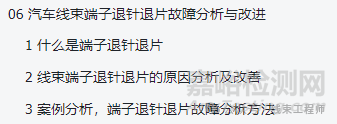 端子退針是線束插接器功能失效的一種常見故障模式。端子退針是指插接器完成裝配后,端子與護套非正常分離,從而使插接器功能喪失。