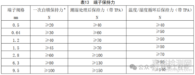 為避免出現(xiàn)端子退針的現(xiàn)象,插接器的性能試驗標準對端子在護套中的保持力做了嚴格規(guī)定,如QC / T 1067中表13: