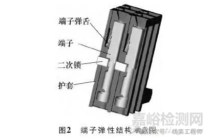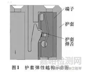 端子上采用彈性結構是指將端子和護套裝配所需要的彈性結構設計在端子上,在端子和護套裝配過程中,通過端子彈舌(設計在端子上的彈性結構)受力變形,實現(xiàn)端子和護套的裝配。在端子和護套裝配到位后,端子彈舌由于受力解除而恢復為原始狀態(tài)。該端子彈舌和設計在護套上的掛臺結構的配合,保證護套對端子的有效定位。