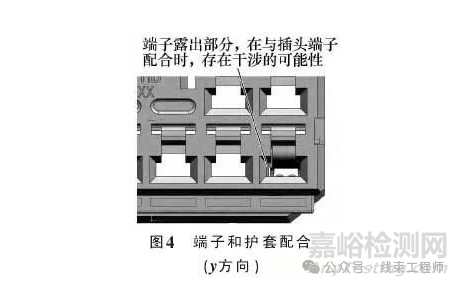 當結構設計存在問題時會出現(xiàn)插接器對插過程中公端子和母端子不對中,這種不對中出現(xiàn)在x方向時(圖3),會出現(xiàn)公端子頂在面B的頂部或面C上,程度較輕時會造成插接器插拔力偏大,程度嚴重時會造成插接器插接過程出現(xiàn)端子退針。這種不對中出現(xiàn)在y方向時(圖4),會出現(xiàn)不應該的母端子露出部分,公端子易頂在母端子露出部分,程度較輕時會造成插接器插拔力偏大,程度嚴重時會造成插接器插接過程出現(xiàn)端子退針。