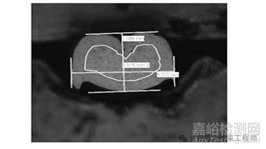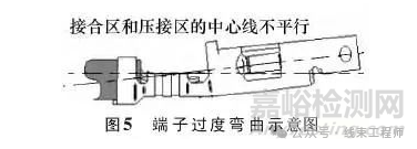 “香蕉”端子是端子壓接過程常出現(xiàn)的問題。是指由于不當壓接導致的端子過度彎曲,使端子的接合區(qū)和壓接區(qū)的中心線不平行,見圖5。