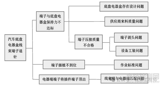 通過系統(tǒng)識別,充分研討分析,找出造成底盤電器盒線束端子退針的可能原因,并逐級拆解分析,結果如上圖所示。