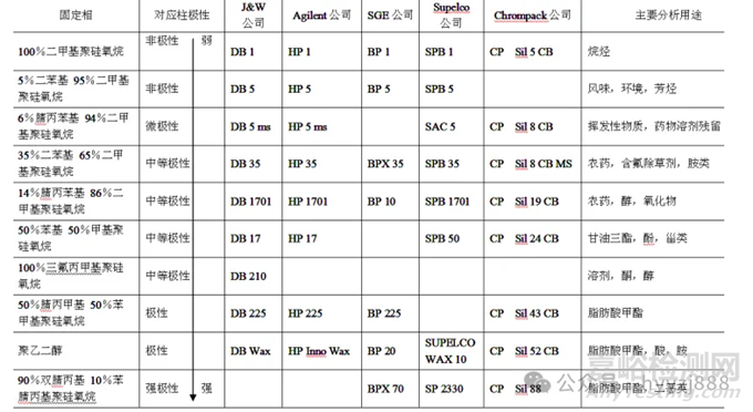 非極性固定相具有更好的抗氧化性、更高的效率和更高的極限操作溫度(最高可達360℃),所以,在可以完成所需分離的情況下,盡可能選擇固定相極性弱的色譜柱,這樣可以延長色譜柱的壽命。分析強極性物質(zhì),如:酸、醛、醇、胺等,為獲得較好分離,需選用極性較強的固定相。有時為了縮短分析時間,也選用與被測物極性相反的固定相。