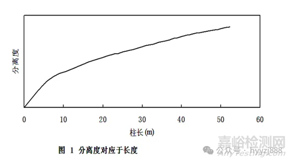 大多數(shù)柱長是15m、30m(過去為12m、25m)和50m的。柱長選擇是由樣品復(fù)雜度或組分的屬性決定的。分析復(fù)雜的樣品或者需要分析多個項目,應(yīng)選用較長及更高效的色譜柱。需要分離少數(shù)幾個組分時,為了提高分析效率選擇具有適宜特性及/或膜厚度的適當(dāng)短的色譜柱。柱長與分離度的關(guān)系見圖1。