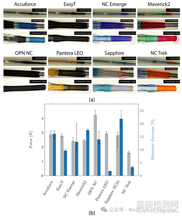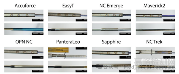圖 2a 展示了各個(gè)尖端設(shè)計(jì)的微觀圖像。除了 NC Trek 導(dǎo)管(其似乎使用填充聚合物)外,所有導(dǎo)管都有金屬(鉑銥合金)不透射線標(biāo)記。NC Trek 導(dǎo)管上的標(biāo)記似乎是填充聚合物。