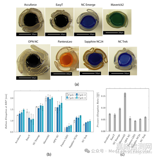 每個(gè)周期的球囊縱向伸長(zhǎng)情況如圖 3b 所示。測(cè)量到的伸長(zhǎng)范圍從 0.6 毫米(Pantera LEO)到 2.0 毫米(Maverick2)不等。Accuforce、OPN、Pantera LEO、Sapphire NC24 和 NC Trek 在四個(gè)測(cè)量周期內(nèi)伸長(zhǎng)量增加。伸長(zhǎng)量與 RBP 的比值如圖 3c 所示,較低的值意味著壓力增加時(shí)伸長(zhǎng)量略有增加,而較高的值則意味著壓力增加時(shí)伸長(zhǎng)量顯著增加。