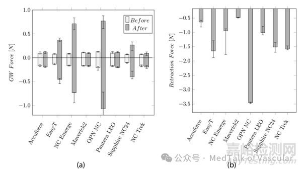 使用手持式導(dǎo)管力測(cè)量裝置(CFMD)在充壓周期前后測(cè)量導(dǎo)絲阻力的結(jié)果如圖 4a 所示。充壓周期后,所需的推力和拉力從大約 0.12N 和 0.21N 增加到 0.37N 和 - 0.46N(EasyT)、± 0.73N(NC Emerge)、0.76N 和 - 1.07N(OPN NC)以及 0.26N 和 - 0.4N(Sapphire NC24)。OPN NC 測(cè)量到的力最大。