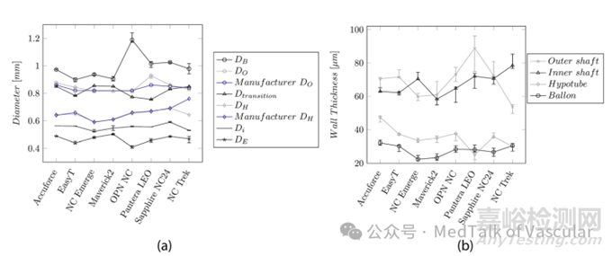不同制造商生產(chǎn)的外軸、內(nèi)軸和海波管的壁厚分別在 54-89μm、58-78μm 和 25-47μm 的范圍內(nèi)變化。球囊的拉伸吹塑制造工藝允許較薄的壁厚(22-32μm)。
